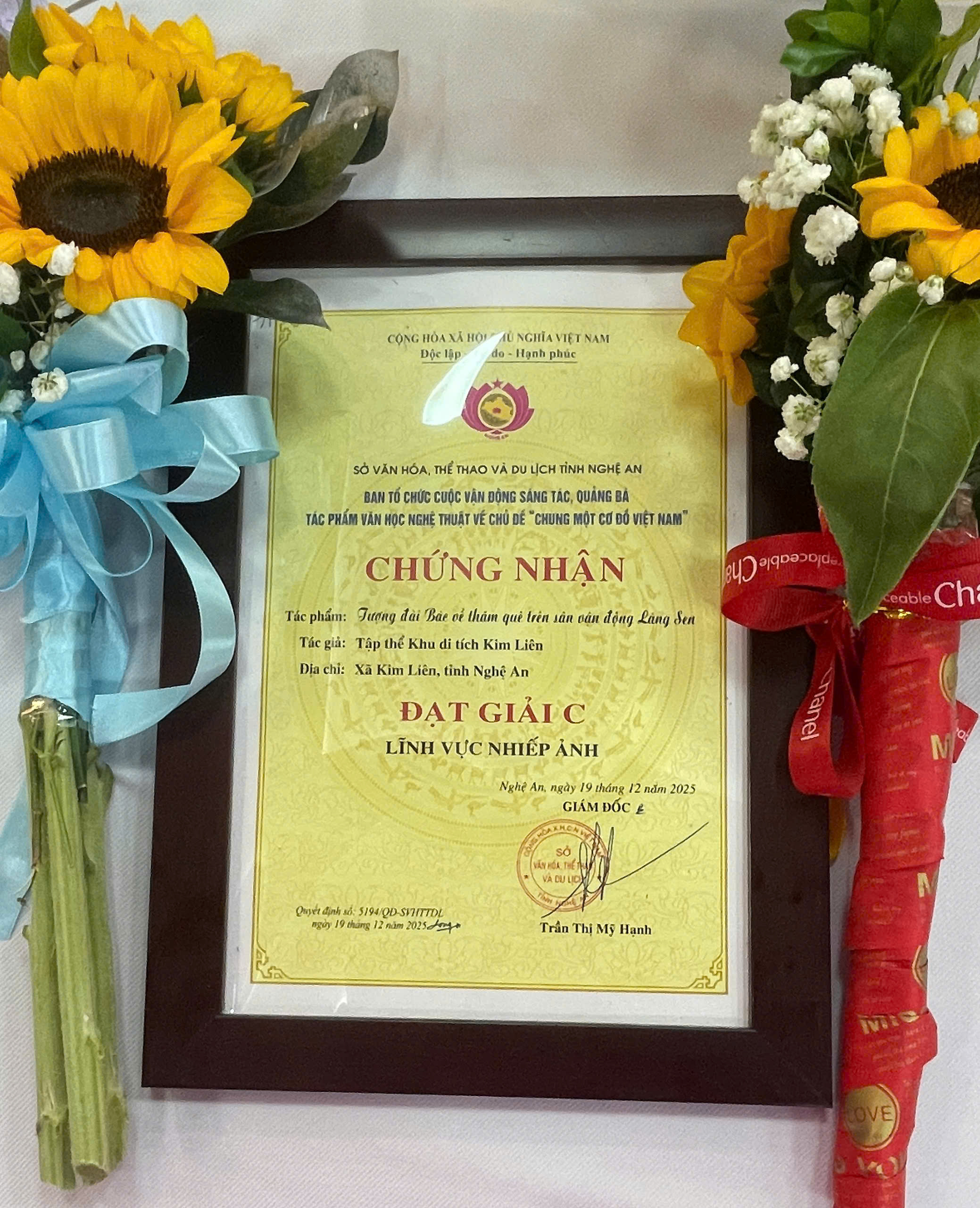 Đặc biệt, tại Cuộc thi Thiết kế và sáng tạo sản phẩm lưu niệm đặc trưng của Nghệ An, Khu di tích Kim Liên đã xuất sắc giành giải Nhất với 4 tác phẩm thiết kế mang chủ đề về Bác Hồ; đồng thời, các tác phẩm tiêu biểu còn được Chủ tịch Ủy ban nhân dân tỉnh Nghệ An tặng Bằng khen, ghi nhận giá trị sáng tạo và ý nghĩa lan tỏa trong công tác quảng bá văn hóa. Các sản phẩm không chỉ bảo đảm tính thẩm mỹ, sáng tạo mà còn hàm chứa chiều sâu văn hóa – lịch sử, góp phần kể câu chuyện về quê hương, tư tưởng và nhân cách của Người thông qua ngôn ngữ mỹ thuật ứng dụng đương đại.