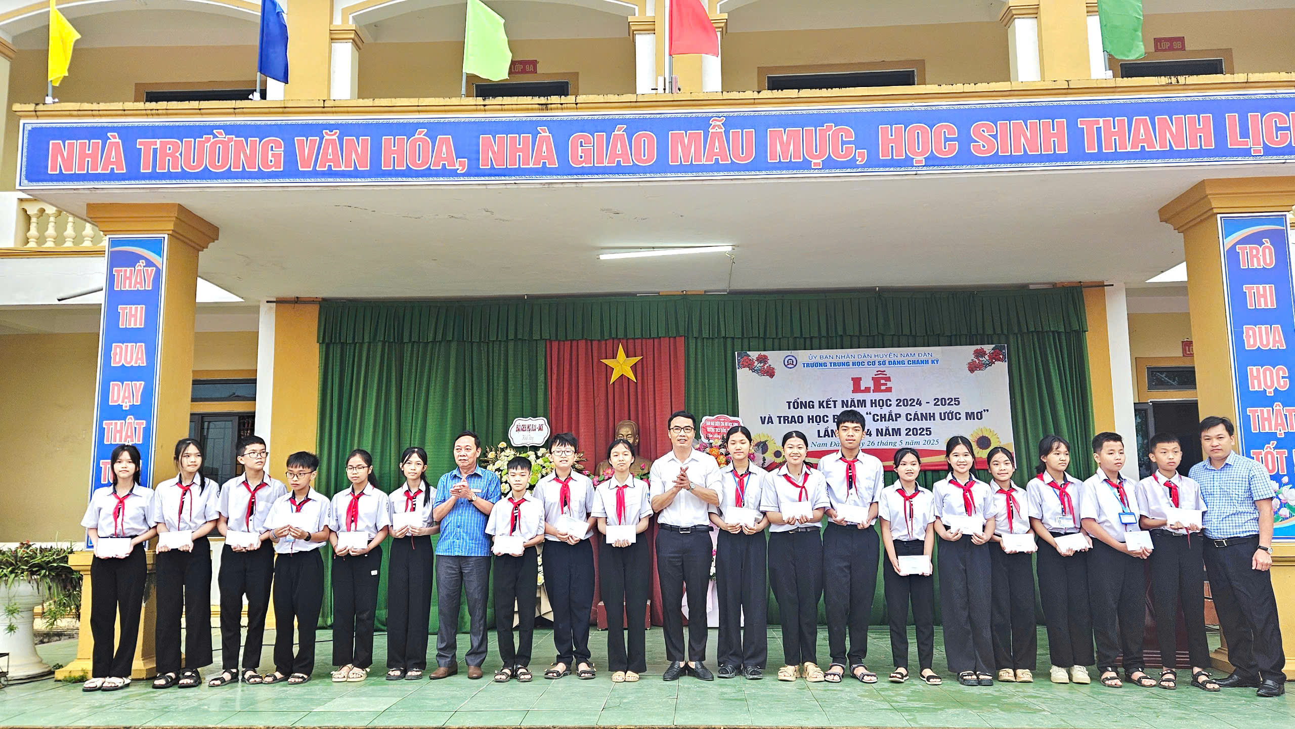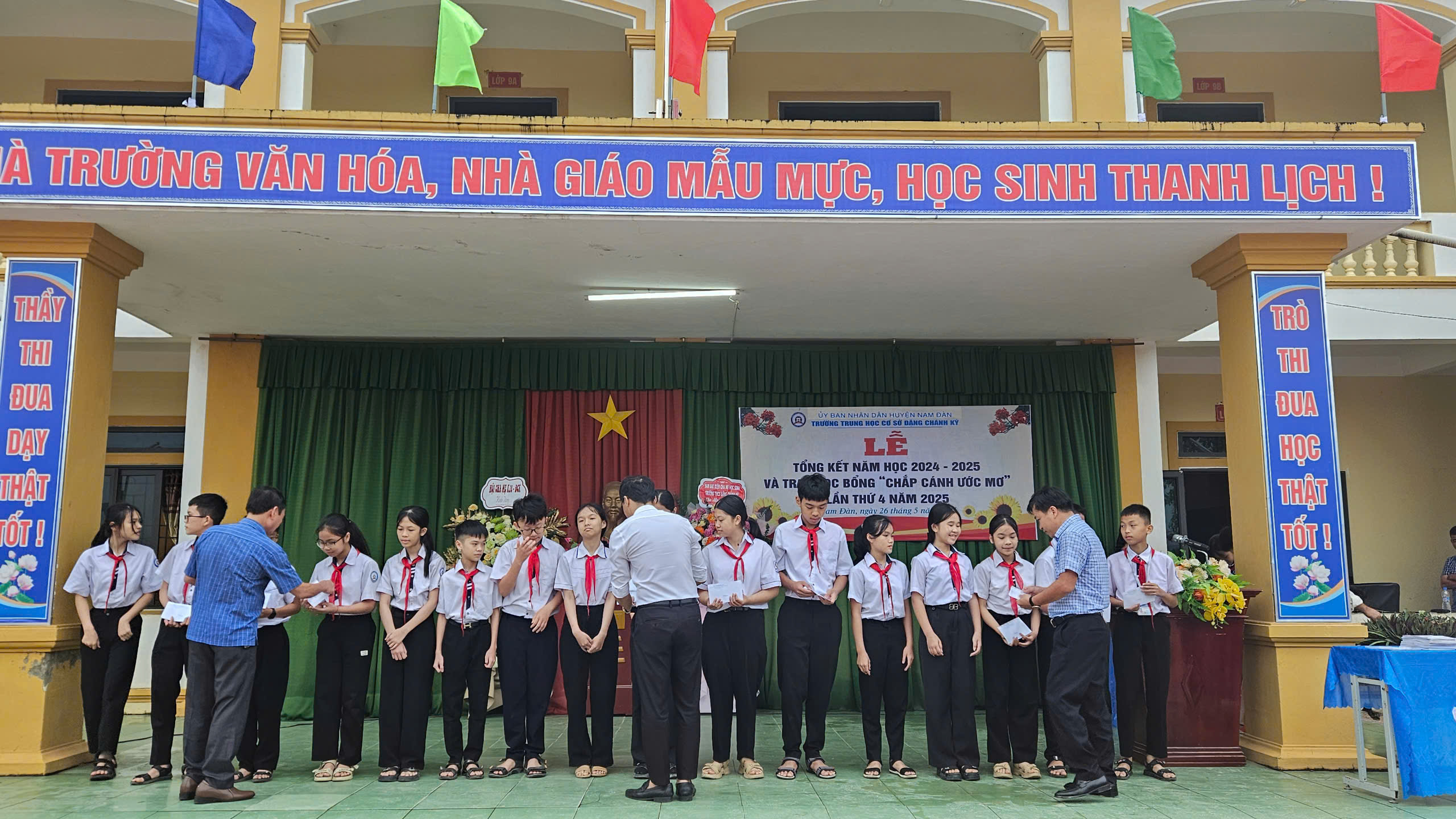 Đồng chí Hà Văn Vinh, Phó Giám đốc Khu di tích Kim Liên trao học bổng “Chắp cánh ước mơ” (đợt 2), cho các em học sinh giỏi và học sinh có hoàn cảnh khó khăn trong Lễ tổng kết năm học 2024 – 2025, tại Trường THCS Đặng Chánh Kỷ, ngày 26/5/2025.