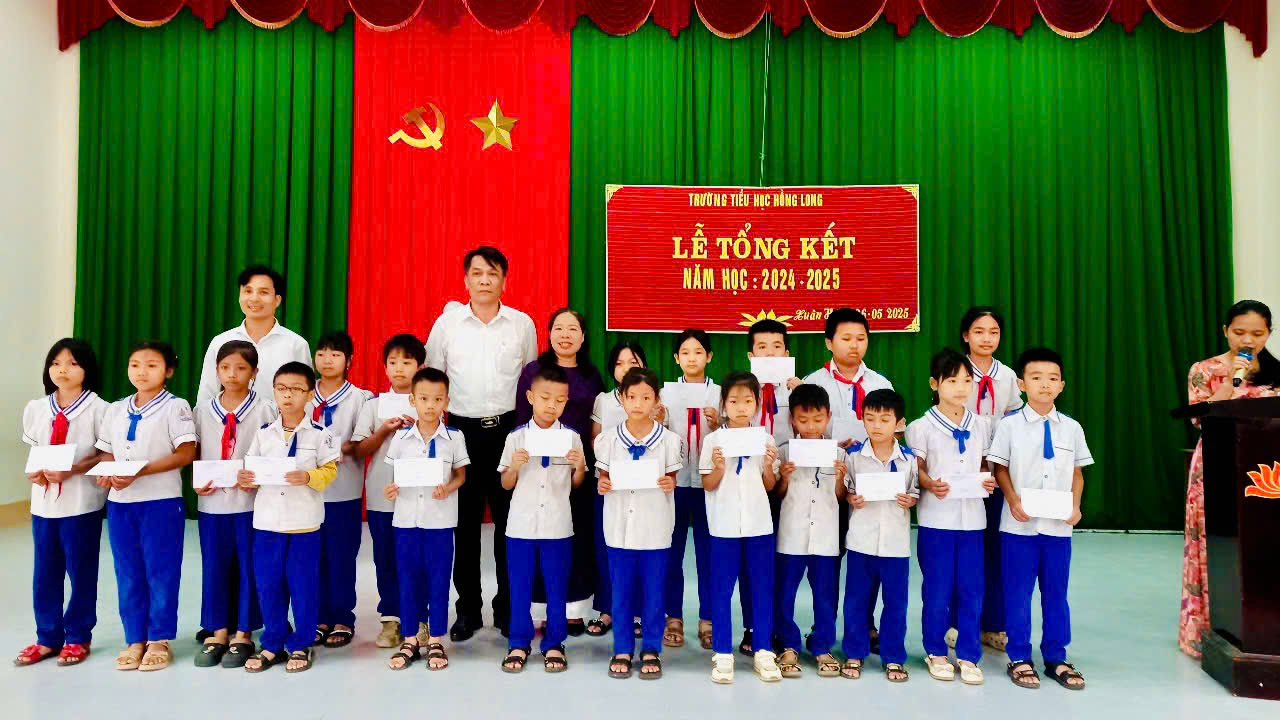 Đồng chí Lâm Đình Hùng – Phó Giám đốc Khu di tích Kim Liên trao học bổng “Chắp cánh ước mơ” (đợt 2), cho các em học sinh giỏi và học sinh có hoàn cảnh khó khăn trong Lễ tổng kết năm học 2024 – 2025, tại Trường Tiểu học Hồng Long, ngày 26/5/2025.