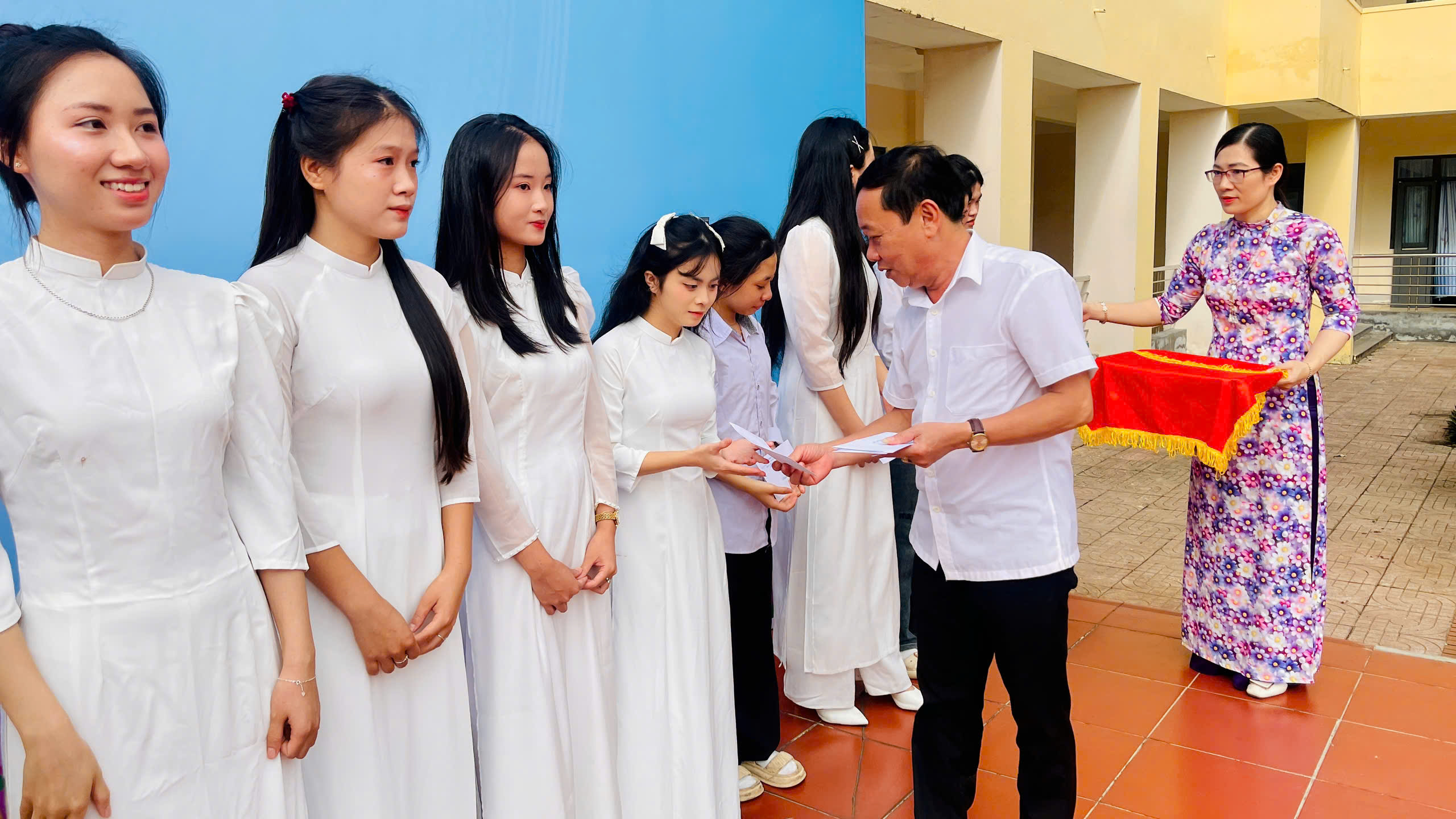 Đồng chí Hà Văn Vinh, Phó Giám đốc Khu di tích Kim Liên trao học bổng “Chắp cánh ước mơ” (đợt 2) cho các em học sinh giỏi và học sinh có hoàn cảnh khó khăn trong Lễ tổng kết năm học 2024 – 2025, tại Trường THPT Kim Liên, ngày 29/5/2025.