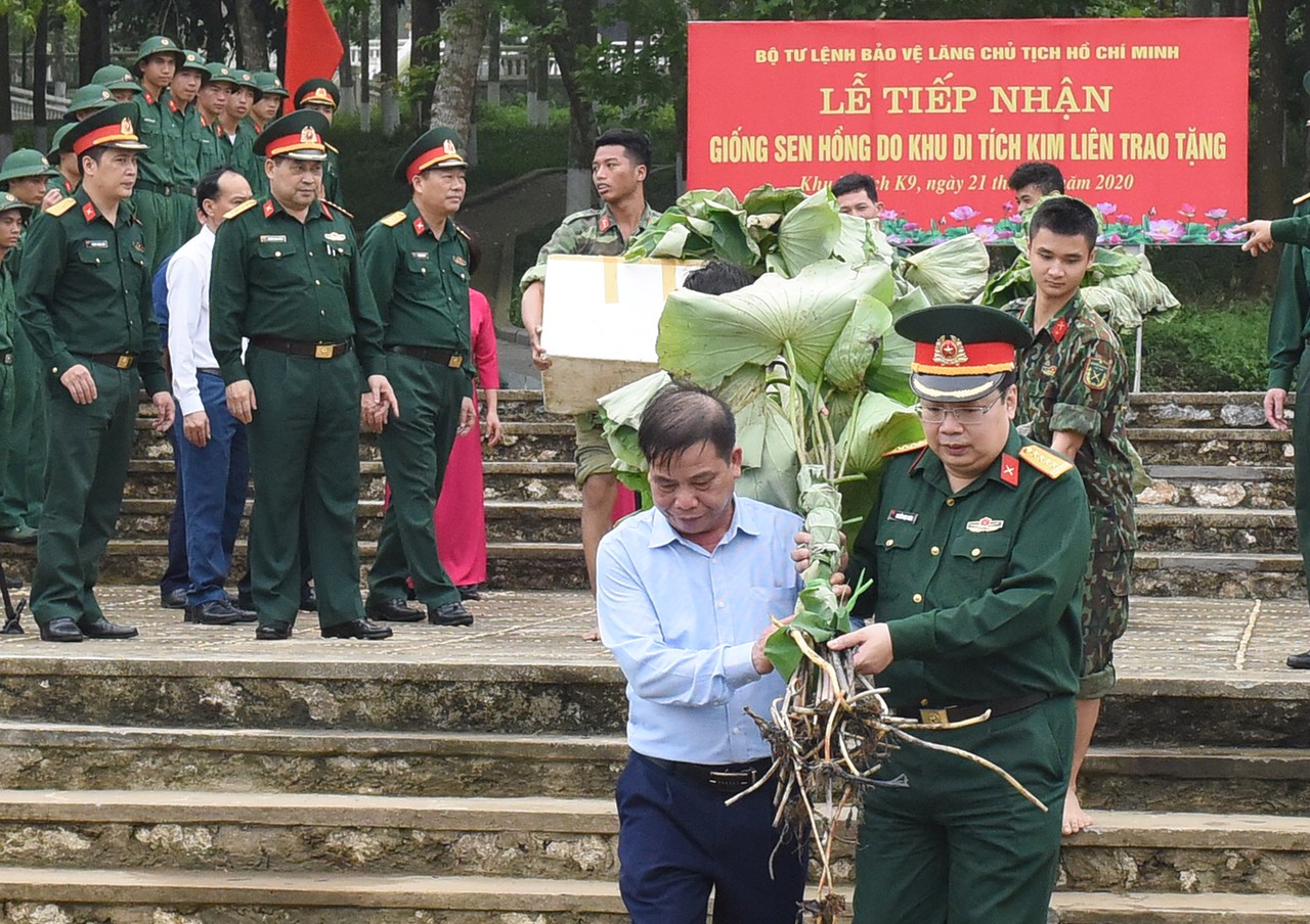 130 gốc Sen Hồng quý được cán bộ Khu di tích Kim Liên vận chuyển từ Nghệ An ra Thủ đô Hà Nội để trao tặng cho đại diện Cán bộ, chiến sĩ Bộ tư lệnh bảo vệ Lăng Chủ tịch Hồ Chí Minh.