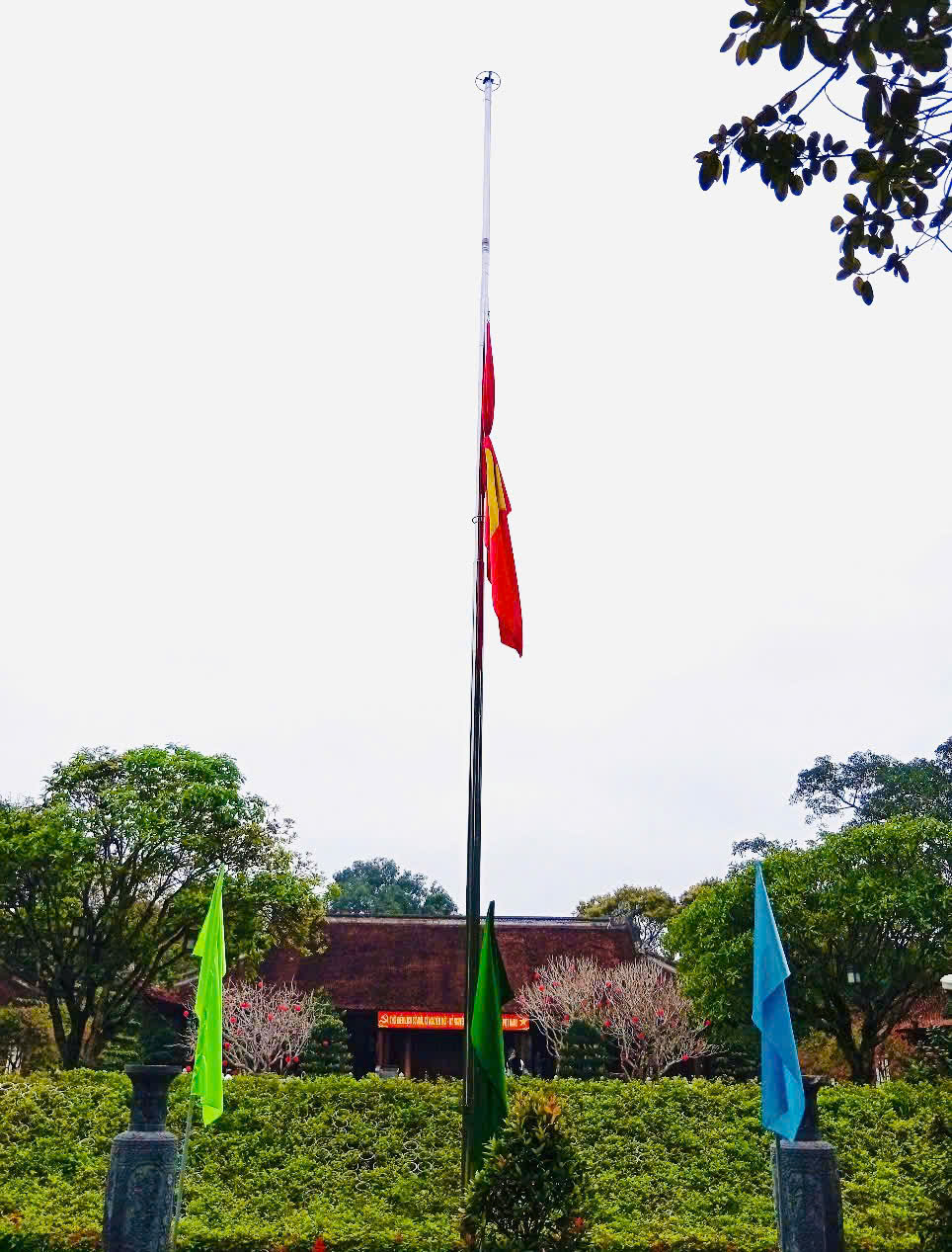 Cờ rũ được treo tại Khu di tích Kim Liên từ 07 giờ sáng ngày 4/4/2025 và sẽ kéo dài đến hết ngày 5/4/2025, trong không khí trang nghiêm và kính cẩn.