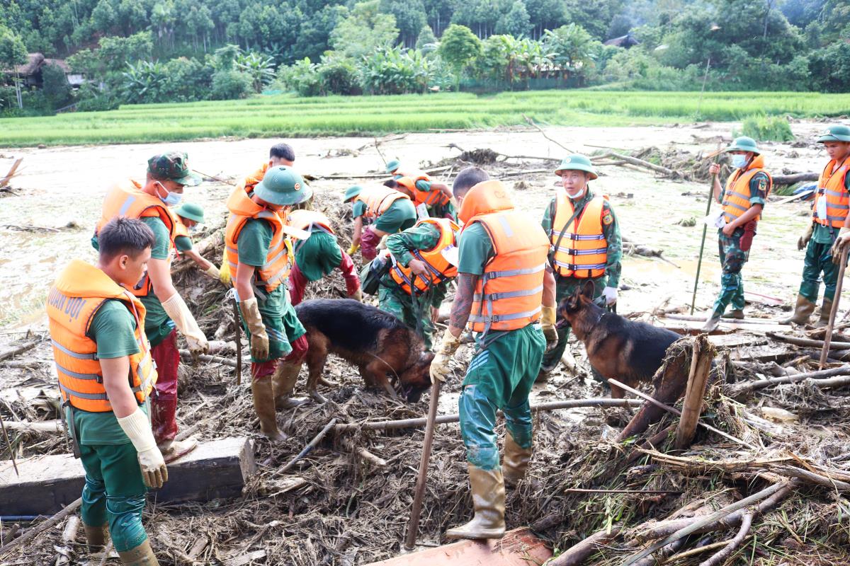 Lực lượng bộ đội biên phòng và chó nghiệp vụ tham gia tìm kiếm nạn nhân mất tích ở Làng Nủ do sạt lở sau cơn bão số 3 (Yagi) gây ra, tháng 8/2024.
