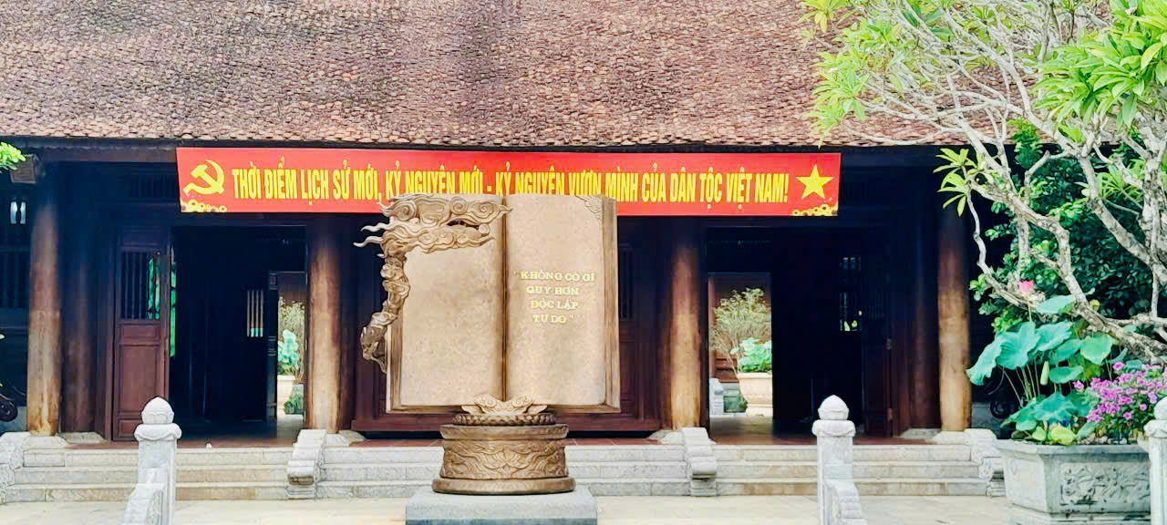 Trong không khí mùa thu lịch sử, Khu di tích quốc gia đặc biệt Kim Liên khoác lên mình sắc đỏ của cờ Đảng, cờ Tổ quốc, pano, khẩu hiệu cùng muôn loài hoa rực rỡ, tạo nên bức tranh rạng ngời và tràn đầy khí thế.